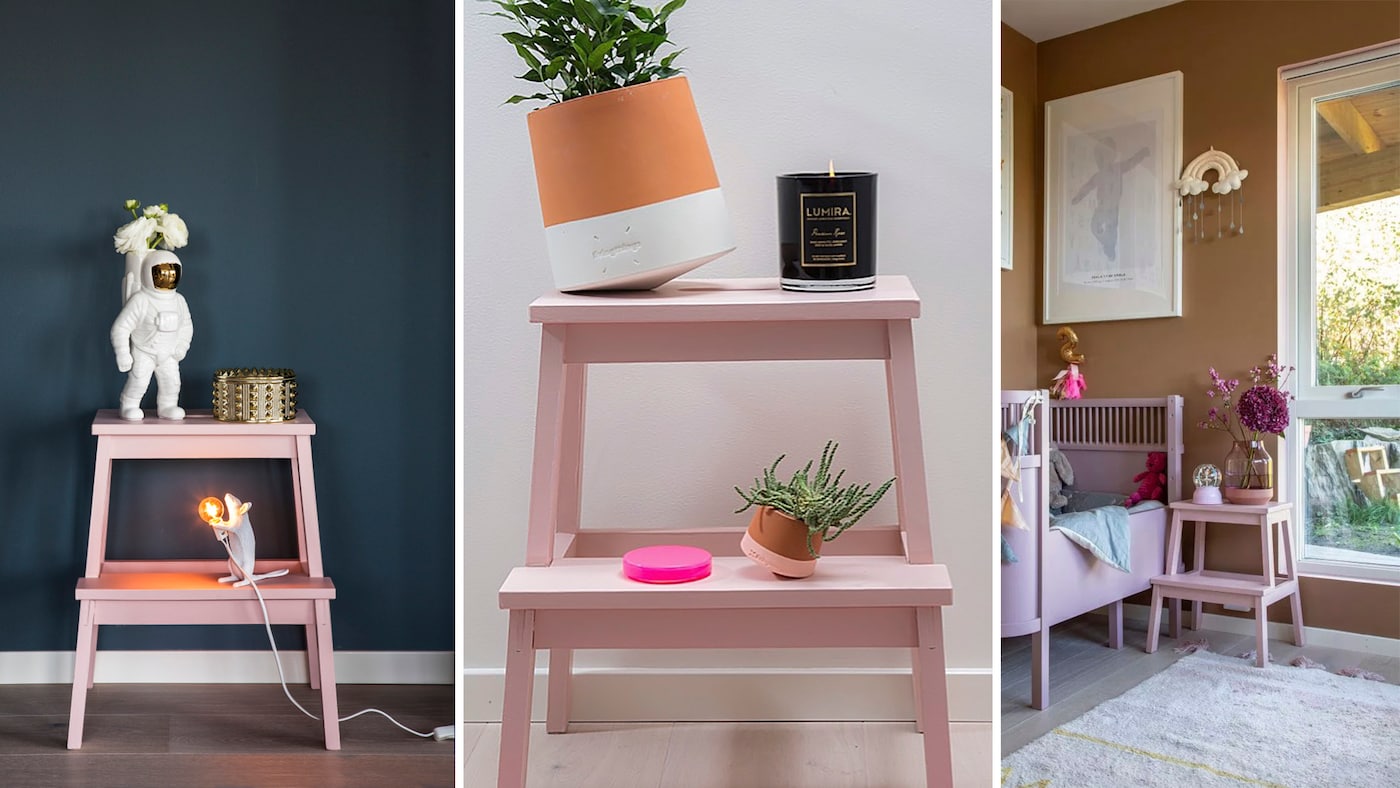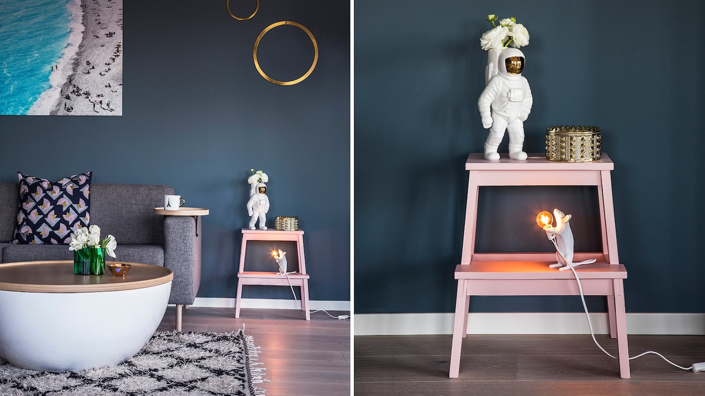 På billedet herunder er den klassiske IKEA-taburet malet med farven Aimforhappiness Peony og væggene er malet med farven AimForHappiness Blue.