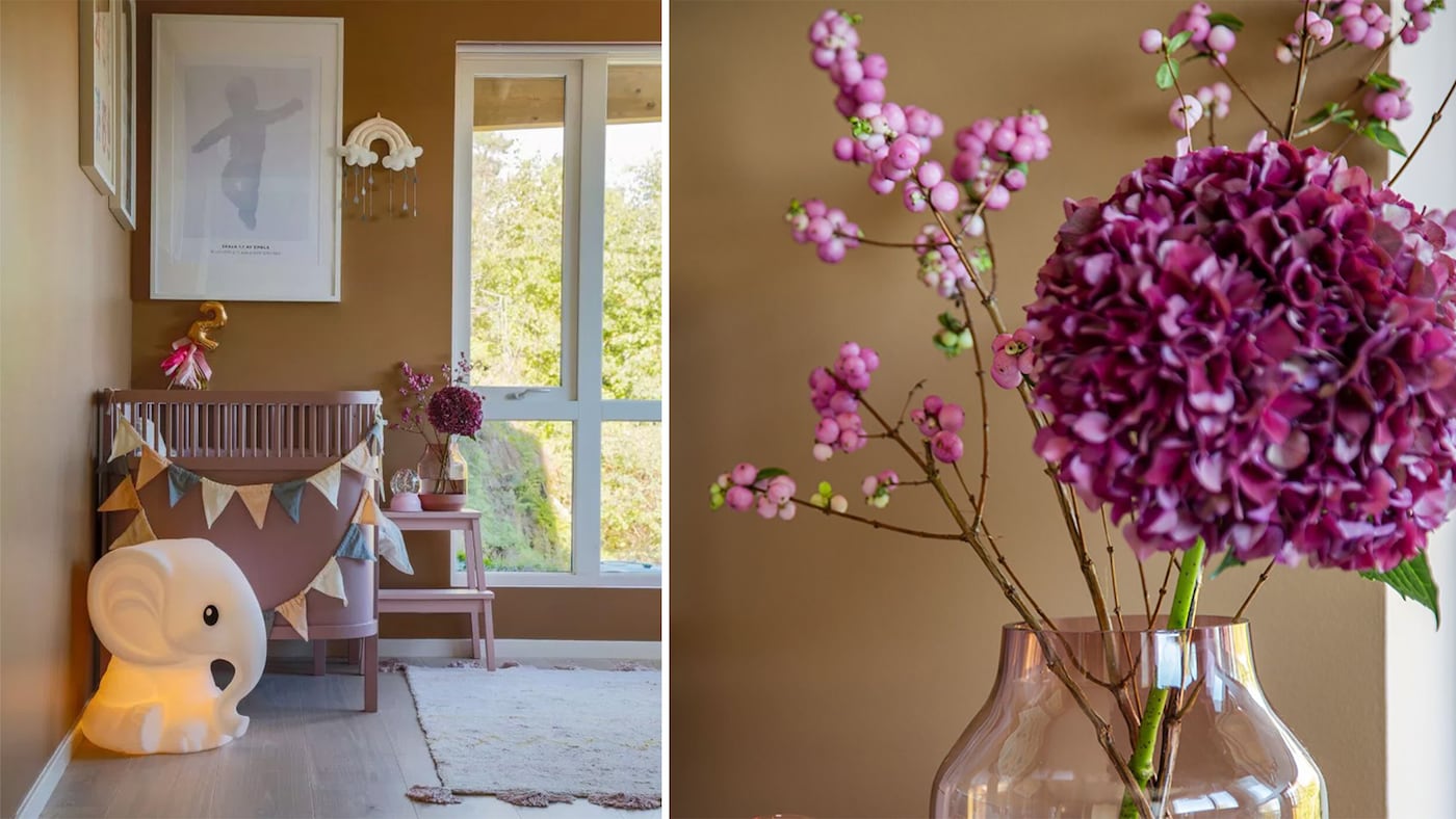 Jeg valgte farverne Aimforhappiness Blue og Aimforhappiness Green Balance, fordi jeg havde et stærkt ønske om at få naturen ind i vores hjem. Aimforhappiness Peony, som desuden er en af farverne i Nordsjös Nordic Colours 2018 palette, er en skøn kontrastfarve til de to andre farver. Peony fungerer lidt som det legesyge og kreative krydderi i paletten.