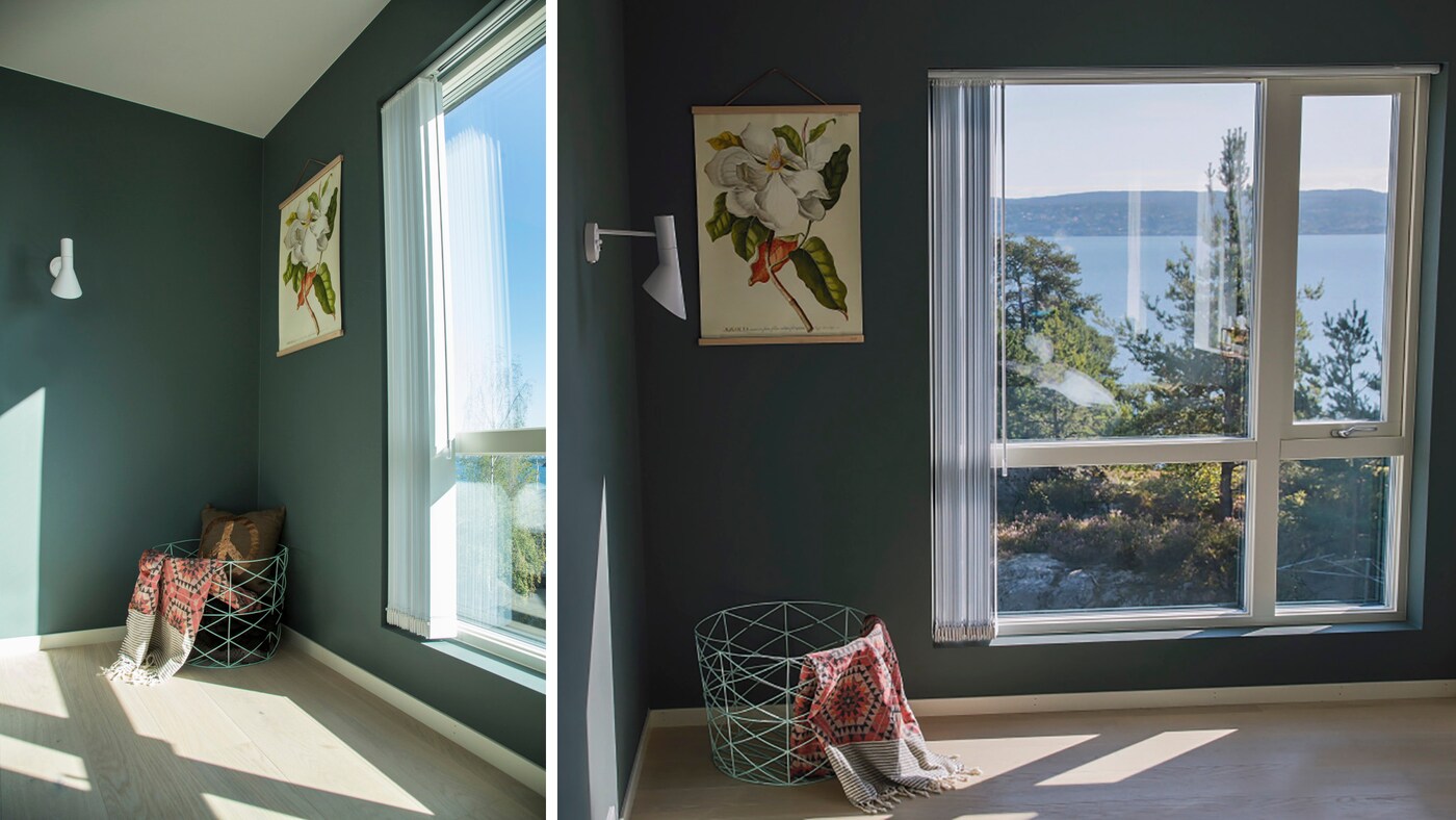Farven AimForHappiness Balance er inspireret både af det blå hav og alt det grønne som naturen har at byde på. Den smukke natur som vi ser lige udenfor vinduet i soveværelset fortsætter inde på væggen i soveværelset og det er ikke en tilfældighed, at AimForHappiness Balance passer perfekt sammen med farven i stuen, AimForHappiness Blue. De to rum ligger en suite med hinanden og helhedsindtrykket, samt muligheden for at fremhæve detaljer, som er et af Jannickes mange egenskaber, bliver meget tydelig her.