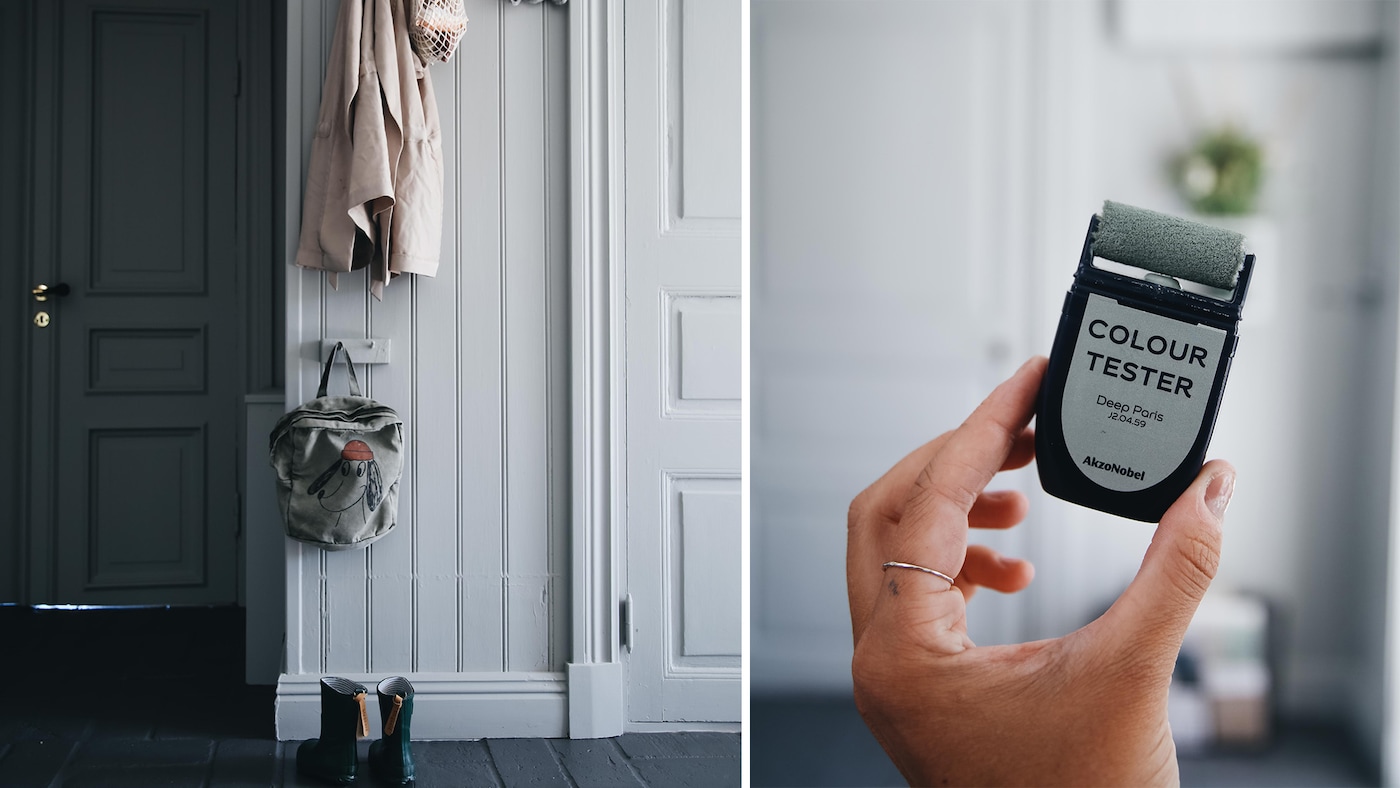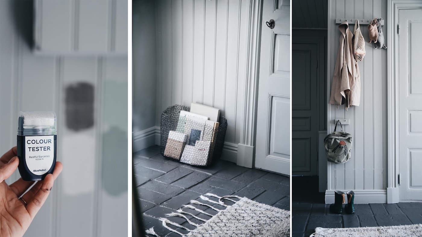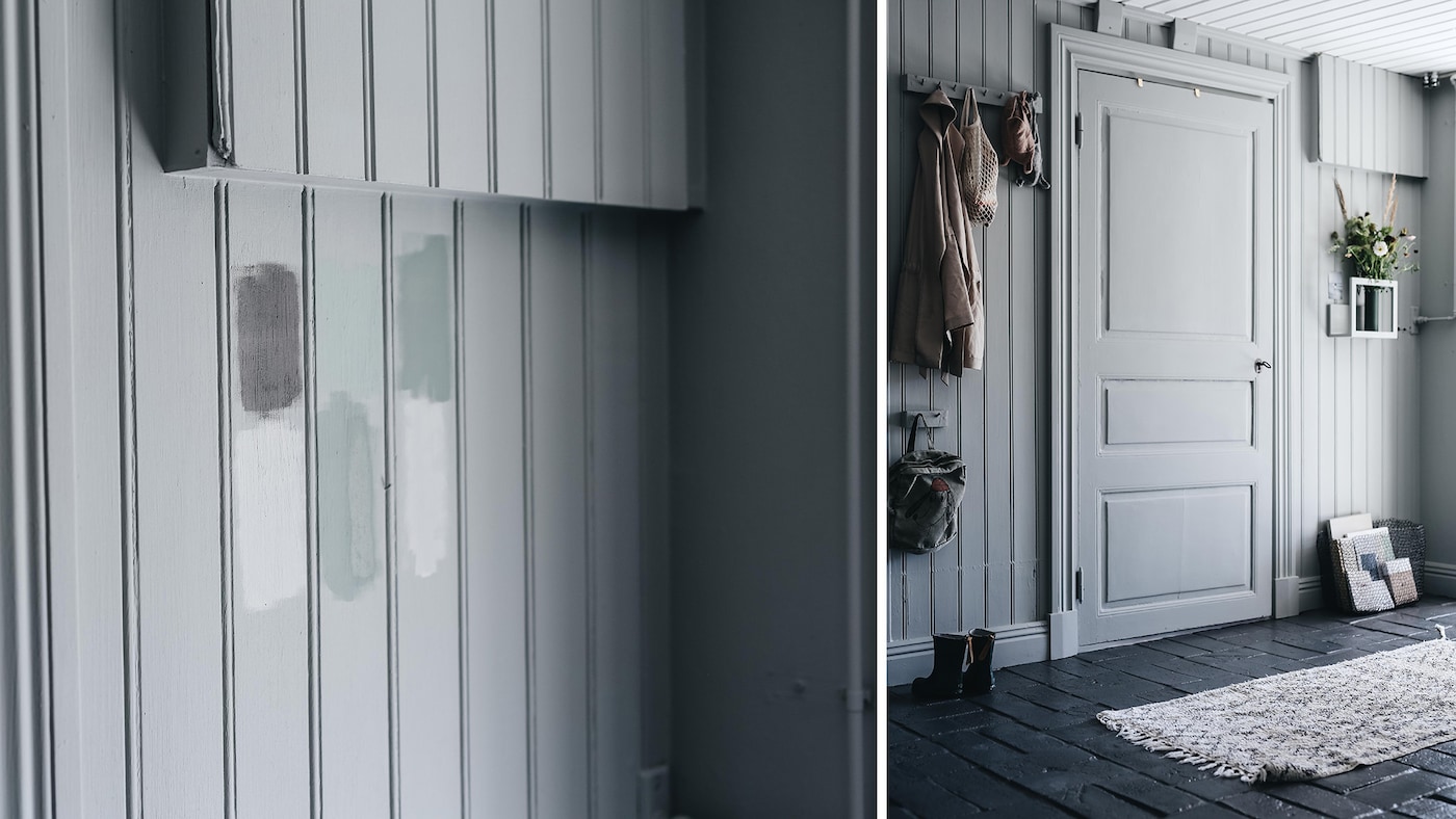 - Jeg kan godt lide den lyse grå-grønne farve sammen med den ret mørke grå jord-farvet farve på gulvet. Entréen blev både lysere og fik mere liv.