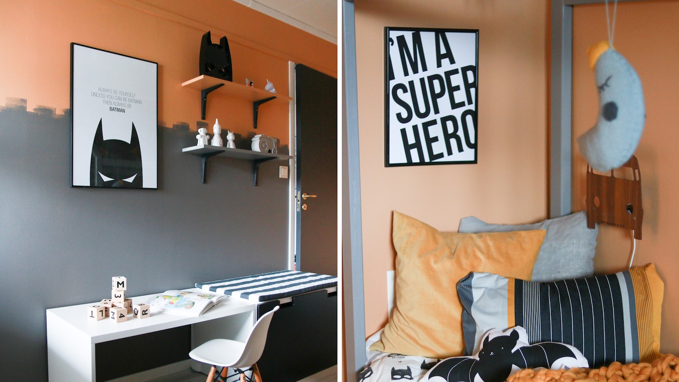 - Da vi skulle vælge farver til paletten havde jeg min søn Sanders børneværelse i tankerne. Det stod overfor en make-over og skulle forvandtes til et ”stor-dreng” værelse, derfor var det vigtigt for mig at tage hensyn til hans interesser. Sanders store helt er Batman, og han er rigtig glad for løver, så derfor blev det mine inspirationskilder, fortæller Katrine.