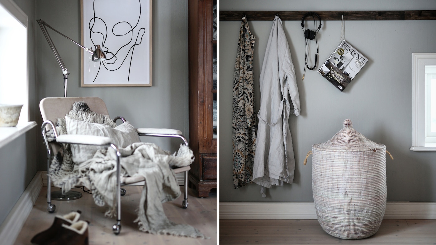 -Når jeg skal vælge farver hjemme, er det vigtigt for mig at der er en rød tråd i indretningen og det gælder for alle rum og materialer. Selv anvender jeg ofte beige og gråt med indslag af grønt. Det er de gennemgående farver for alle rum og materialer hjemme hos os, fortæller Lena. Et af de smukkeste rum er soveværelset, som hurtigt fik en kærlig overhaling, og hvor neutrale farver og materialer nu er i fokus. Fra den fine seng, som får alt den plads den fortjener og de smukke originale trægulve til træmøblerne med charmerende patina. Alt dette indrammes af væggene som har fået en mat finish i Lenas egen dæmpede grågrønne signaturfarve ”Lenas Dusty Green”, som giver rummet et løft og endnu mere personlighed uden at være for meget.