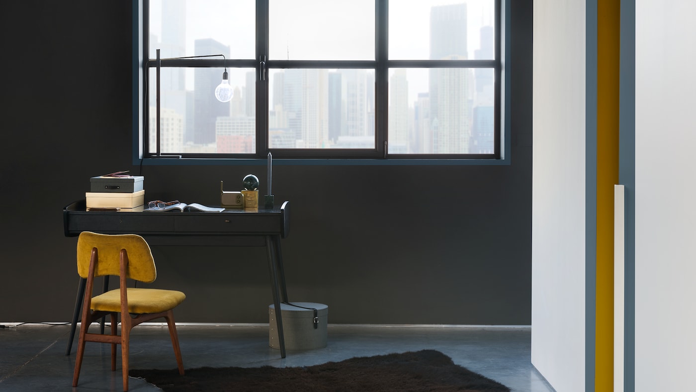 Årets farve 2017 – Denim Drift – er helt central for denne nye følelse af, at vi ejer vores arbejdsområder. Den jordagtige, gråblå tone er et køligt og sikkert udgangspunkt for fokus og koncentration. "Prøv at bruge okker eller brændt orange som accentfarver," siger Marieke Wielinga, Global Colour Designer hos AkzoNobel. "Disse farver bringer mindelser om 1950'ernes stil, som vi ser hos Le Corbusier, og som giver dit arbejdsområde det sofistikerede Mad Men-look."