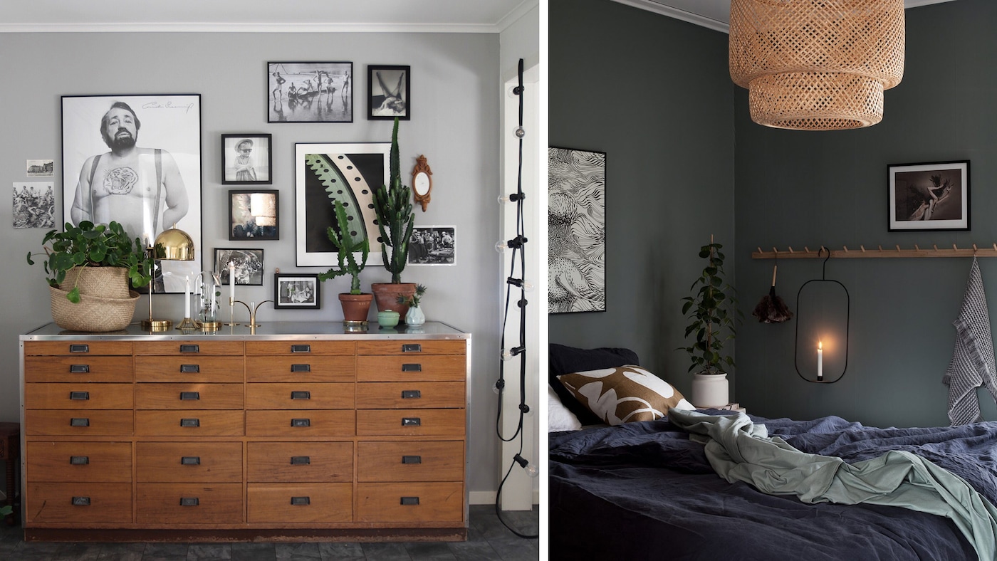Farvekortet Greyish delights tilbyder sobre smukke farver som samler hjemmet uden at tage over. Et smukt eksempel på dette er hvordan influencer Janniche Kristoffersen, som har bloggen @bloggaibagis, har anvendt farven Nordsjö evening shadow i sit soveværelse (billede til højre). Den grønne farvetone giver en ekstra dimension og skaber tydeligere kontraster. Fra paletten med neutrale og medium, i den lyse og mørke skala, har Anna Grundberg, som arbejder med illustration og kunst, og desuden har bloggen @annagrundberg , malet med farven Nordsjö sky grey (billedet til venstre) i sin stue. Se hvordan kommodens varme træ og de grønne planter skaber en balanceret harmoni sammen med den neutrale vægfarve.