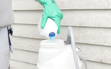 3. Bland produktet efter dit behov. Til let snavsede overflader blandes 1 del Universal Grundrens med 20 dele vand. Til meget snavsede overflader blandes 1 del Universal Grundrens med 10 dele vand. Hvis du bruger en lavtrykssprøjte, kan du med fordel blande direkte i beholderen. Hvis du har en facade, der er malet med alkyd/olieholdig maling eller træbeskyttelse, bør du bruge blandingen 1 del Universal Grundrens med 20 dele vand, for ikke at skade malingoverfladen, der ved brug af en kraftigere blanding, kan miste glans og blive mere mat efter behandlingen.